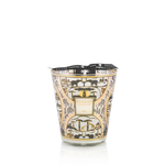 The Afrika scented candle is made in glass decorated with a silkscreened print in black and 9-carat gold. The design features large spheres in which African scenes unfold in the tradition of tribal drawings. The flame shines through the glass and its movement brings to life the small African scenes of the silkscreened print.
