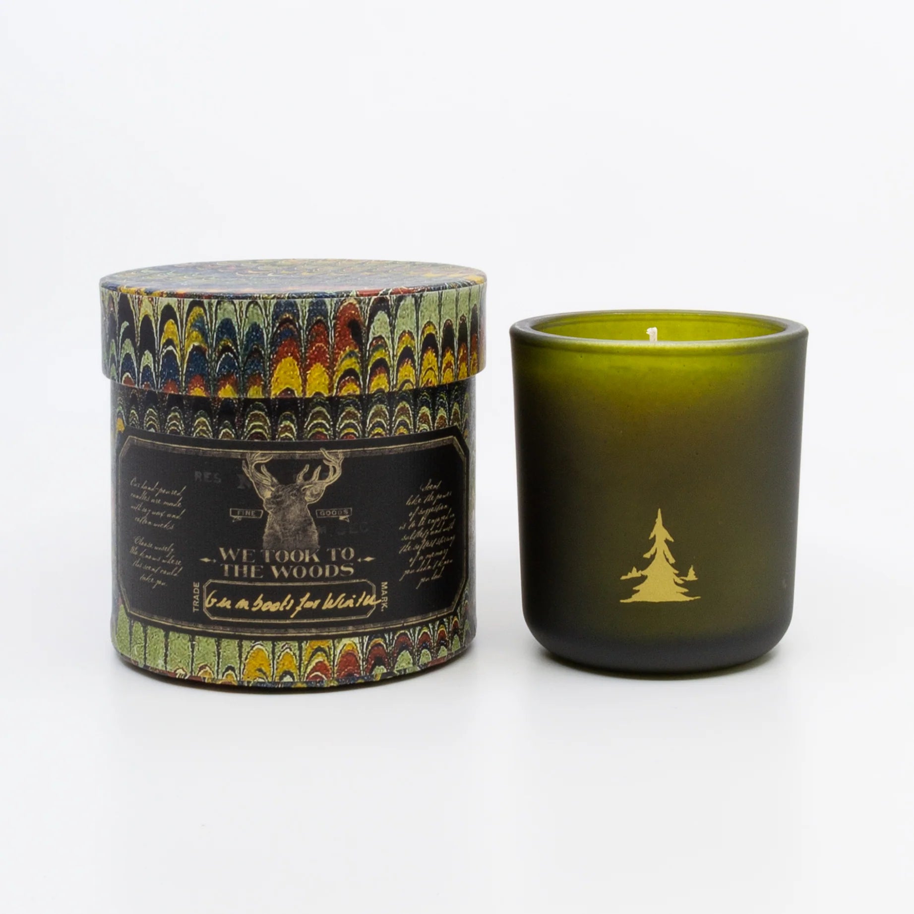 SCENT NOTES: Orange Spice, Fir, Pine, Smoke Classic frosted glass container with gold tree in marbled packaging.