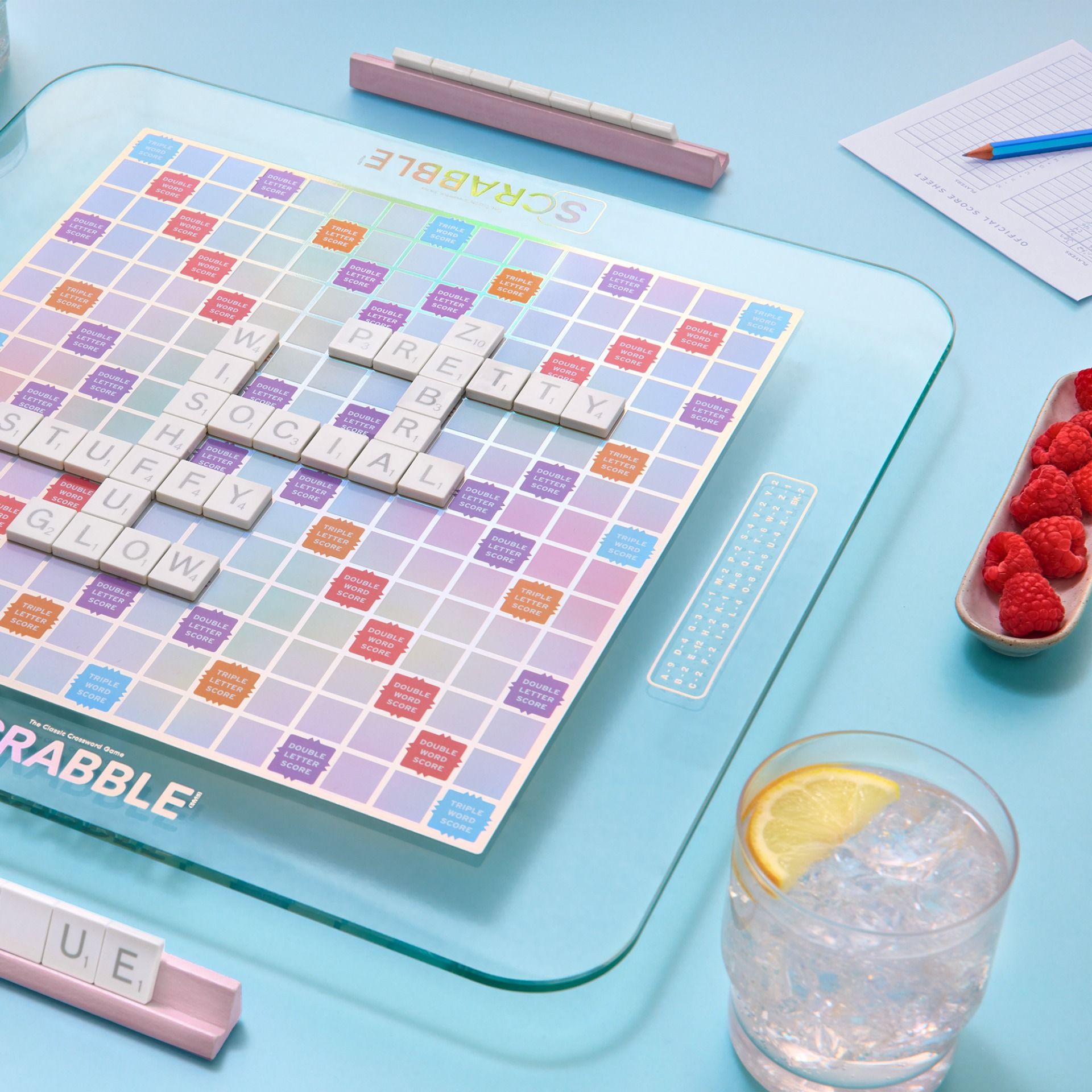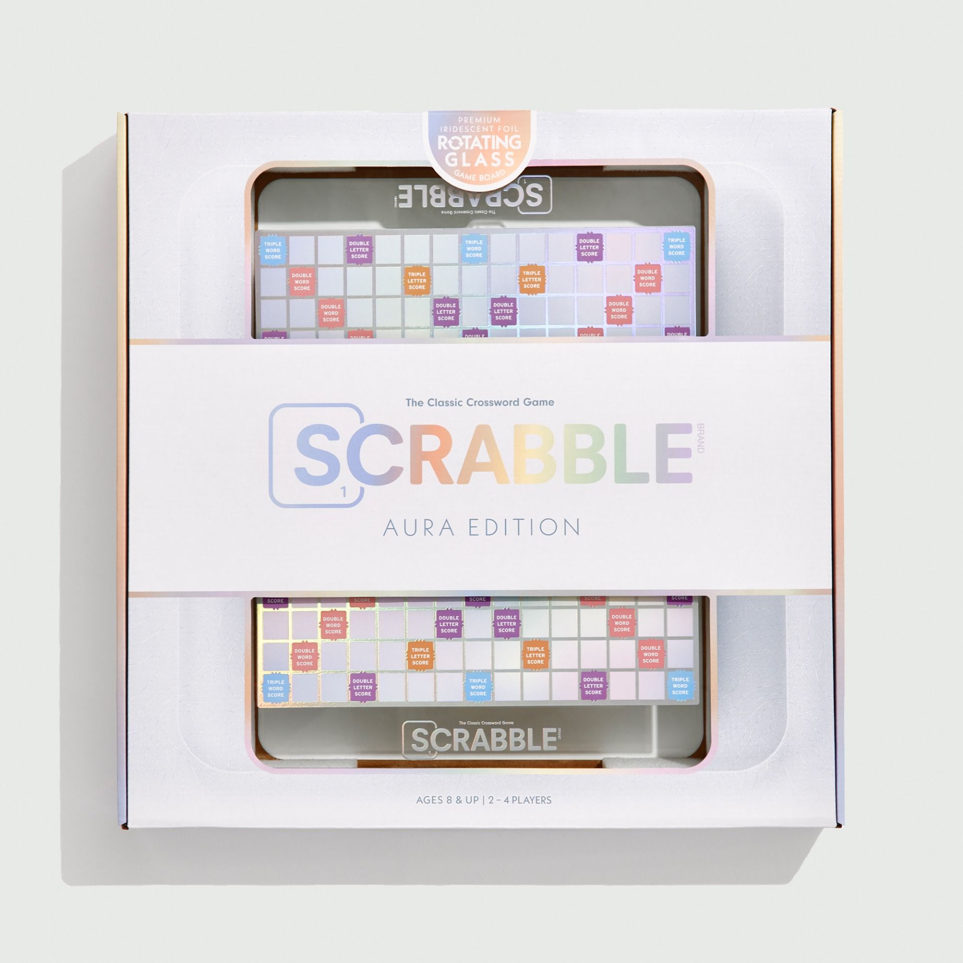 Game night gets a glow-up with Scrabble Aura Edition. This high-quality glass game board shimmers with serene colors that reflect the vibe of any room. Smoothly rotate the board and watch as iridescent foil accents illuminate every word, creating a mesmerizing play of light and color. Express your personal style like never before with this premium edition of Scrabble. Turn every move into a masterpiece and let your aura shine through with each word you play.