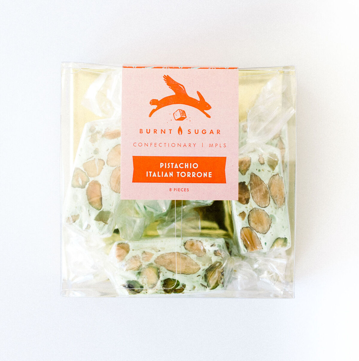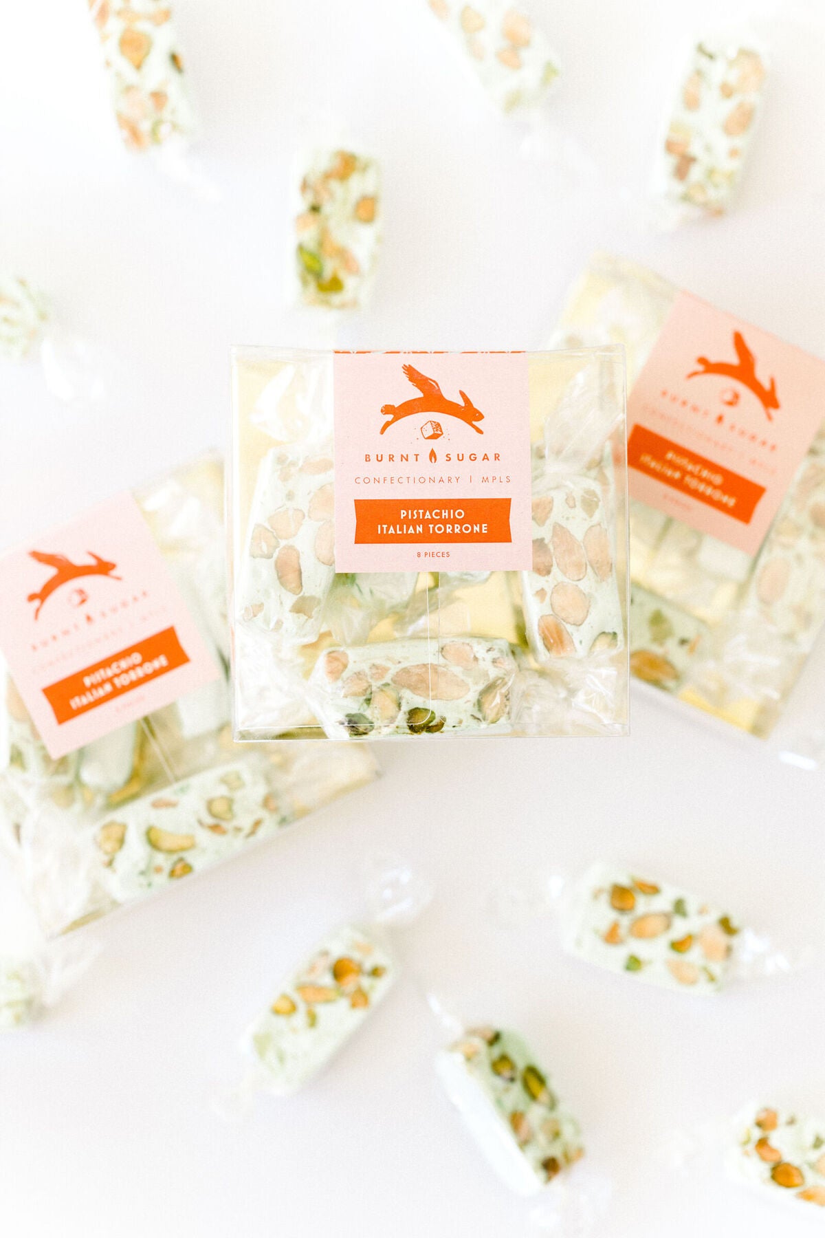 Pistachio lovers rejoice! Chewy pistachio nougat is loaded with toasted pistachios and almonds and studded with bright candied lemon peels. (8 pieces)