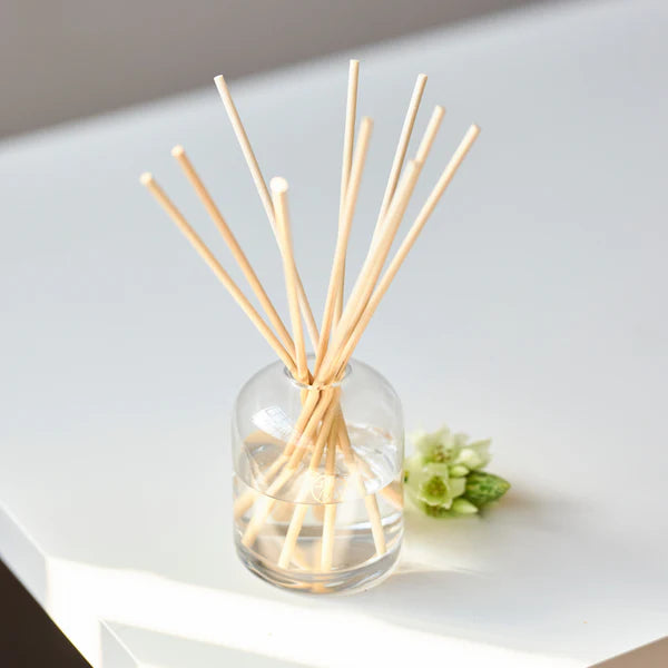 NEROLI | MANDARIN | BERGAMOT Perfect for spaces requiring less attention but enjoy the same care, natural rattan reeds disperse fragrance to your environment. Kit Includes a mouth-blown refillable clear glass, premium scent blend refill, and rattan reeds requiring a regular flip or swirl to enjoy.