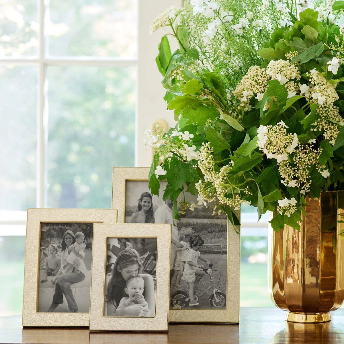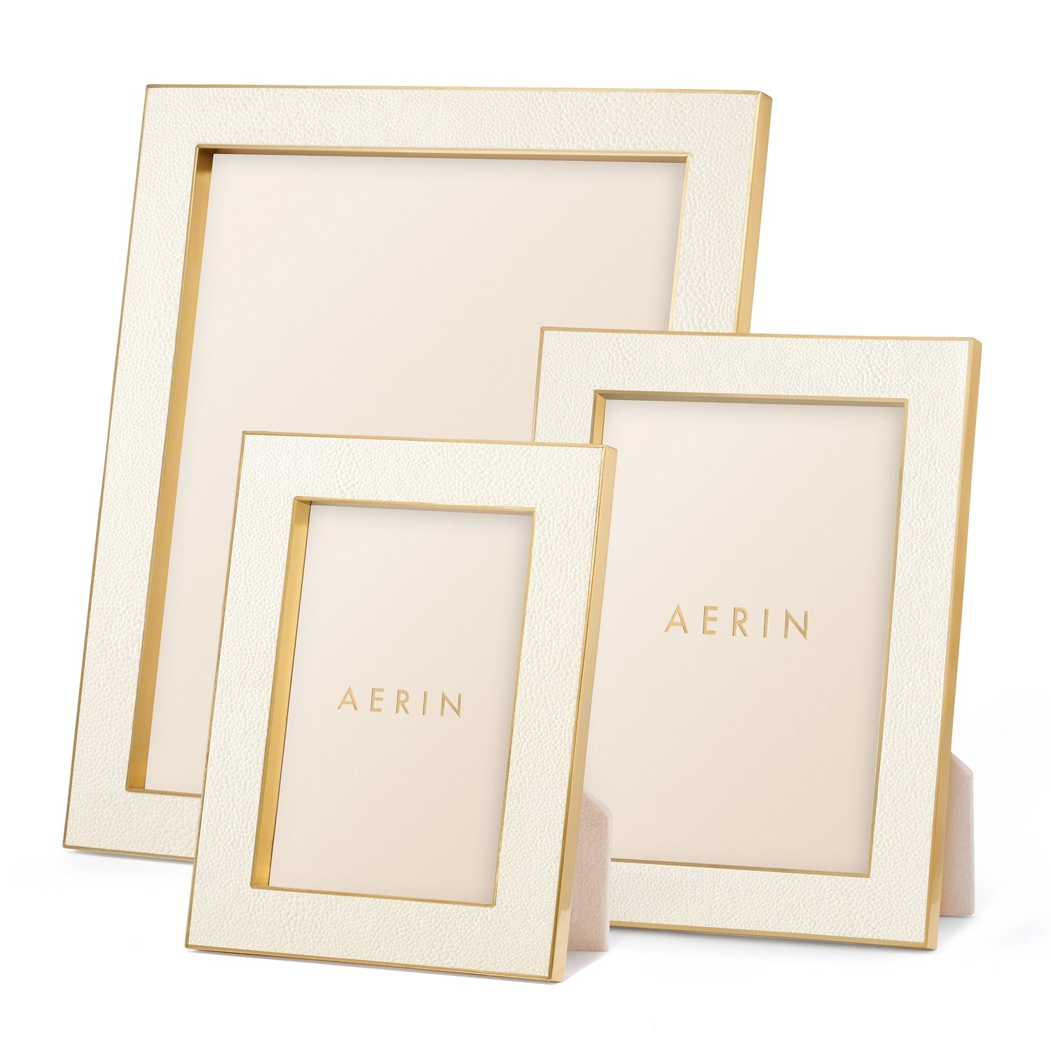 This modern yet classic frame juxtaposes the luxury and texture of embossed shagreen trimmed in polished brass. The versatile color elegantly displays a favorite family photo or a small piece of art.