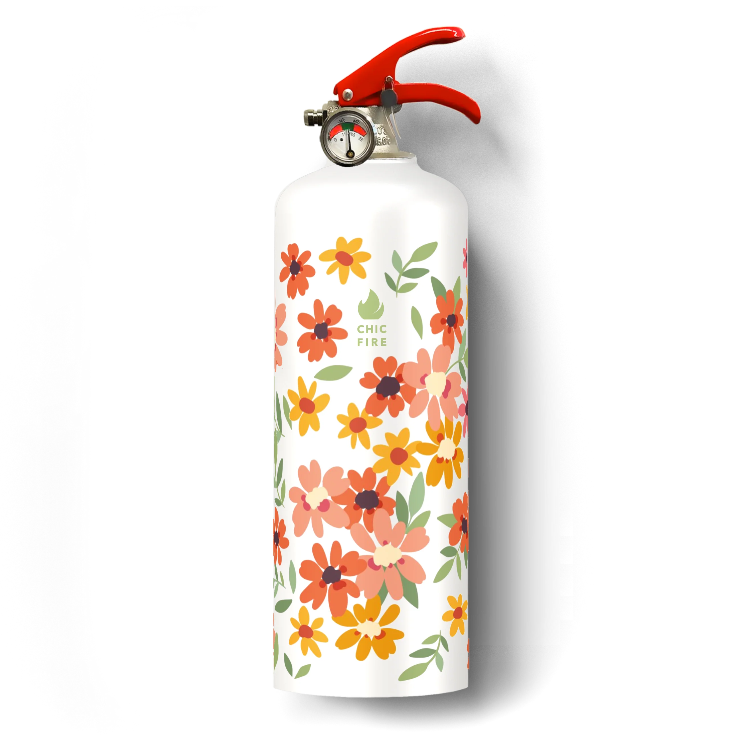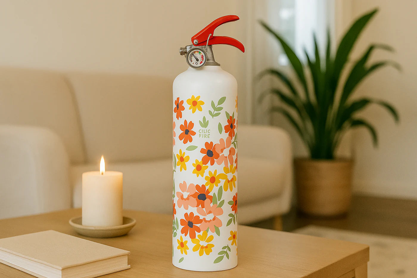The Autumn Flowers fire extinguisher transforms a life-saving essential into a statement piece. With vibrant floral patterns in warm orange, coral, and golden tones, it blends effortlessly into your home while standing ready for emergencies.