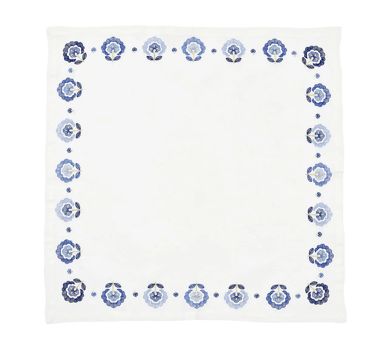 The Carnation Napkin captivates with embroidered florals that fuse vibrant colors and an extra fanciful dose of gold to reflect the petal’s quaint ruffles. As a timeless emblem of devotion, this carnation trim in shades of blue is precious yet modern. For garden luncheons, summer weddings and everyday meals, complete the look with the coordinating tablecloth.