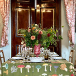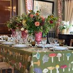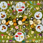 Reimagined from 18th and 19th century illustrations in John Derian's extensive archive, a vintage array of mushrooms dance across this spirited table linen in riotous shades. Set on a deep avocado green ground, formed as a kaleidoscopic vision of nature's edible forest floor finds.